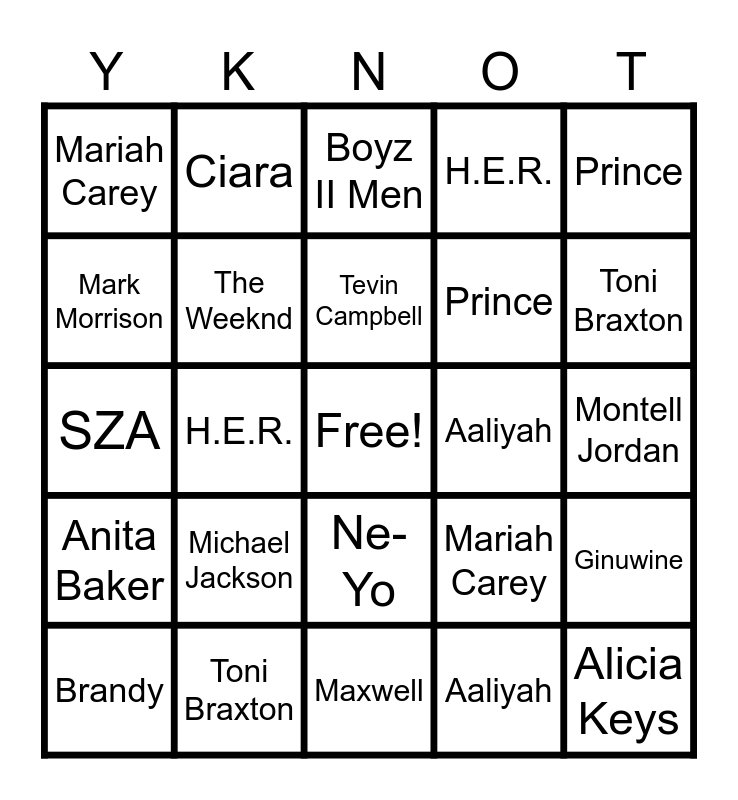 ⚠ This card has duplicate items: Alicia Keys (2), Beyoncé (2), Boyz II Men (2), Brian McKnight (2), Bruno Mars (2), Chris Brown (2), Destiny’s Child (2), Dru Hill (2), Ella Mai (2), Fugees (2), Ginuwine (2), H.E.R. (2), Mariah Carey (2), Mario (2), Mark Morrison (2), Mary J. Blige (2), Michael Jackson (2), Monica (2), Montell Jordan (2), Ne-Yo (2), Prince (2), SZA (2), Tevin Campbell (2), The Weeknd (2), TLC (2), Tyrese (2), Usher (2), Whitney Houston (2), Anita Baker (2), Toni Braxton (2), Erykah Badu (2), Maxwell (2), Sade (2), Brandy (2), Aaliyah (2), Janet Jackson (2), D'Angelo (2), John Legend (2)