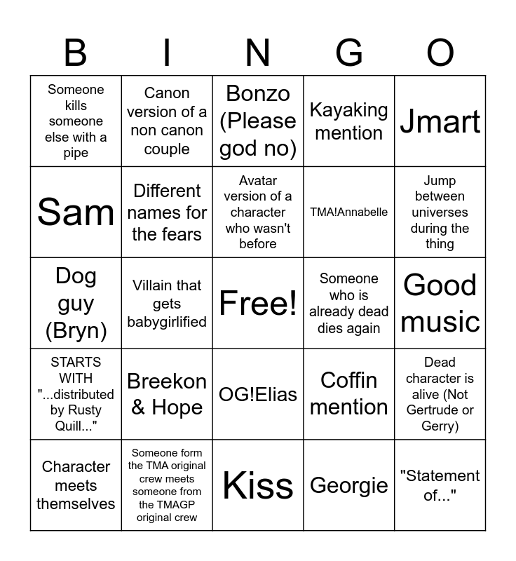 This bingo card has a free space and 24 words: Breekon & Hope, Someone form the TMA original crew meets someone from the TMAGP original crew, Avatar version of a character who wasn't before, Character meets themselves, Jmart, Someone kills someone else with a pipe, Sam, Canon version of a non canon couple, Someone who is already dead dies again, OG!Elias, TMA!Annabelle, Dog guy (Bryn), Coffin mention, Dead character is alive (Not Gertrude or Gerry), Different names for the fears, Georgie, Good music, Bonzo (Please god no), Jump between universes during the thing, Villain that gets babygirlified, "Statement of...", STARTS WITH "...distributed by Rusty Quill...", Kayaking mention and Kiss.
