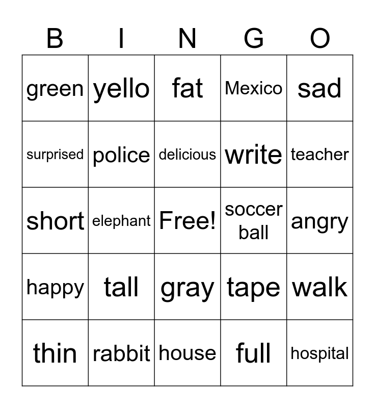 This bingo card has a free space and 29 words: thin, eat, elephant, hungry, green, fat, police, tall, soccer ball, rabbit, angry, hospital, house, full, teacher, cook, gray, happy, sad, short, tape, doctor, write, surprised, Mexico, yello, walk, delicious and house.