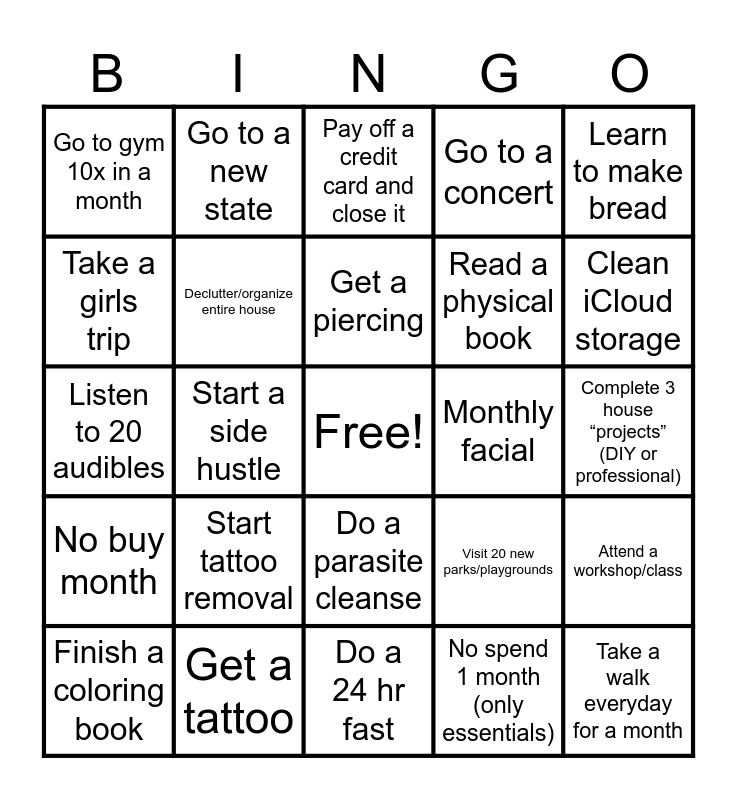 This bingo card has a free space and 24 words: Start tattoo removal, Get a tattoo, Get a piercing, Finish a coloring book, Learn to make bread, Go to gym 10x in a month, Take a girls trip, Go to a new state, Monthly facial, Do a parasite cleanse, Read a physical book, Listen to 20 audibles, Visit 20 new parks/playgrounds, Attend a workshop/class, Declutter/organize entire house, No spend 1 month (only essentials), Complete 3 house “projects” (DIY or professional), Pay off a credit card and close it, Clean iCloud storage, Start a side hustle, Take a walk everyday for a month, No buy month, Go to a concert and Do a 24 hr fast.