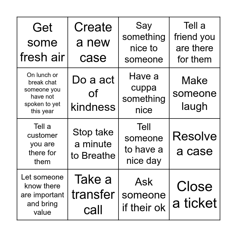 This bingo card has 16 words: Take a transfer call, Resolve a case, Say something nice to someone, Get some fresh air, Tell a customer you are there for them, Create a new case, Tell someone to have a nice day, Ask someone if their ok, On lunch or break chat someone you have not spoken to yet this year, Do a act of kindness, Let someone know there are important and bring value, Tell a friend you are there for them, Stop take a minute to Breathe, Make someone laugh, Have a cuppa something nice and Close a ticket.