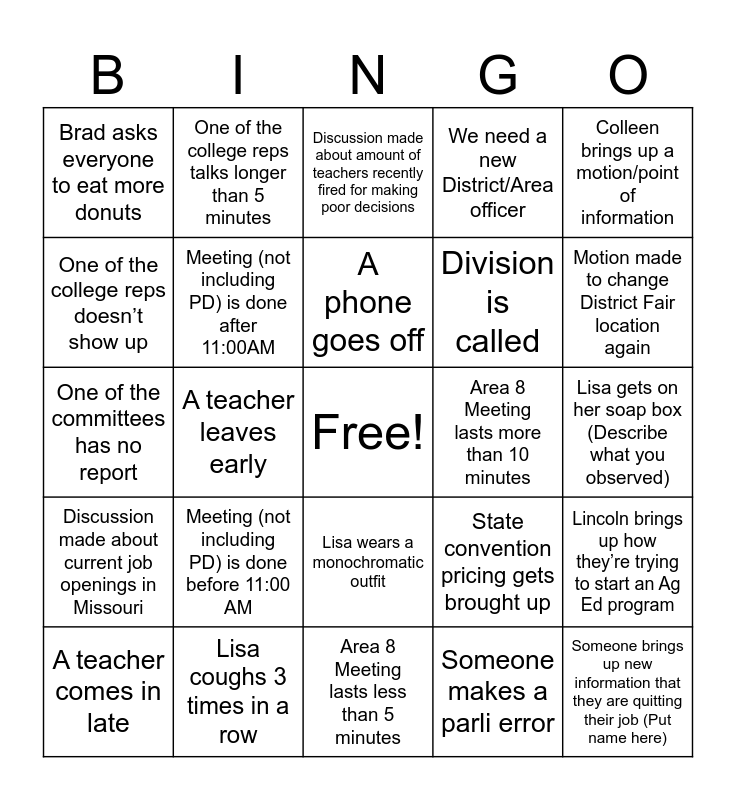 This bingo card has a free space and 26 words: Lisa wears a monochromatic outfit, Someone makes a parli error, A phone goes off, Lisa coughs 3 times in a row, Colleen brings up a motion/point of information, Brad asks everyone to eat more donuts, One of the college reps doesn’t show up, One of the college reps talks longer than 5 minutes, Lisa gets on her soap box (Describe what you observed), State convention pricing gets brought up, Division is called, One of the committees has no report, Lincoln brings up how they’re trying to start an Ag Ed program, A teacher comes in late, A teacher leaves early, The afternoon PD session is cancelled, We need a new District/Area officer, Discussion made about current job openings in Missouri, Discussion made about amount of teachers recently fired for making poor decisions, Someone brings up new information that they are quitting their job (Put name here), Motion made to change District Fair location again, Area 8 Meeting lasts less than 5 minutes, Area 8 Meeting lasts more than 10 minutes, Meeting (not including PD) is done before 11:00 AM, Meeting (not including PD) is done after 11:00AM and Zach Crews seconds more than 3 motions.