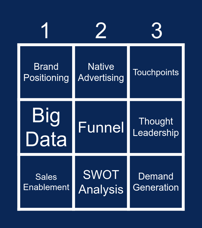 This bingo card has 101 words: Free!, Account-Based Marketing, Funnel, Employee Empowerment, Customer Journey, Social Selling, SEO Vertical, Neuromarketing, Marketing Automation, Inbound Marketing, GRP (Gross Rating Points), CPC (Cost Per Click), KPIs (Key Performance Indicators), Personalization, Programmatic Buying, Omnichannel, Content Marketing, Lead Generation, Conversion Rate Optimization, Paid Media, Organic Reach, User-Generated Content (UGC), Influencer Marketing, Dynamic Creatives, Data-Driven, Cross-Platform Marketing, Big Data, Brand Awareness, Engagement Rate, Return on Investment (ROI), Native Advertising, Touchpoints, Click-Through Rate (CTR), A/B Testing, Geo-Targeting, Heatmaps, Attribution Modeling, Retargeting, Customer Lifetime Value (CLV), Brand Advocacy, Content Strategy, Digital Transformation, Interactive Content, Agile Marketing, Real-Time Marketing, Programmatic Advertising, Data Visualization, Behavioral Targeting, Smarketing (Sales + Marketing), Growth Hacking, Disruptive Innovation, Thought Leadership, Customer-Centric Marketing, Brand Storytelling, Micro-Moments, Mobile-First Marketing, Social Listening, Content Curation, Evergreen Content, Lead Nurturing, Sales Enablement, Marketing Qualified Lead (MQL), Sales Qualified Lead (SQL), Key Account Management (KAM), Customer Relationship Management (CRM), Demand Generation, Lead Scoring, Marketing Mix (4Ps/7Ps), Market Segmentation, Target Audience, Unique Selling Proposition (USP), Value Proposition, Brand Positioning, Competitive Analysis, SWOT Analysis, Market Research, Customer Insights, Persona Development, Buyer Journey Mapping, Content Calendar, Keyword Research, Link Building, Landing Page Optimization, Email Marketing, Social Media Marketing, Search Engine Marketing (SEM), Pay-Per-Click (PPC), Display Advertising, Video Marketing, Affiliate Marketing, Public Relations (PR), Media Relations, Crisis Communication, Brand Guidelines, Marketing Budget, Metrics and Analytics, Data Analytics, Performance Marketing, Conversion Funnel, Customer Acquisition Cost (CAC) and Churn Rate.