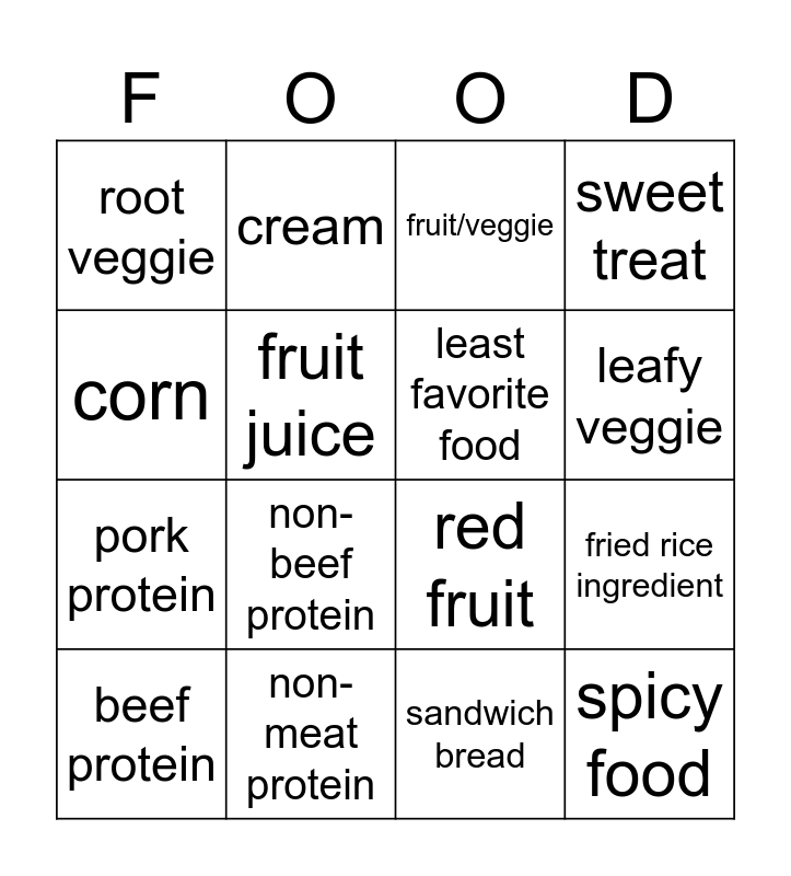 This bingo card has 24 words: Seafood, whole grain, leafy veggie, junk food, corn, root veggie, fruit juice, cream, non-meat protein, dairy drink, pork protein, red fruit, green melon, nuts, least favorite food, pizza topping, sandwich bread, fruit/veggie, non-beef protein, fried rice ingredient, beef protein, spicy food, sweet treat and sour fruit.