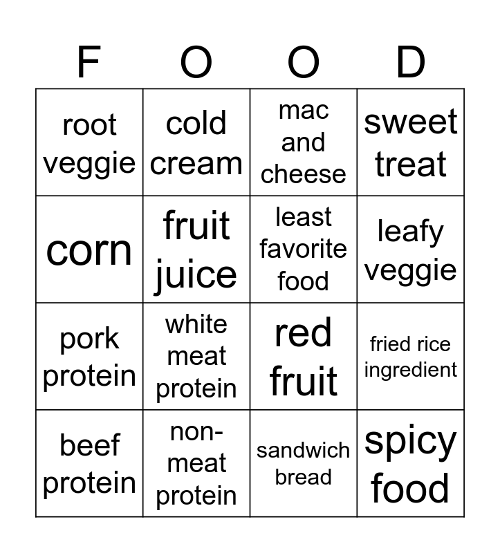 This bingo card has 24 words: Seafood, whole grain, leafy veggie, junk food, corn, root veggie, fruit juice, cold cream, non-meat protein, dairy drink, pork protein, red fruit, tacos/ nachos, nuts, least favorite food, pizza topping, sandwich bread, mac and cheese, white meat protein, fried rice ingredient, beef protein, spicy food, sweet treat and sour fruit.