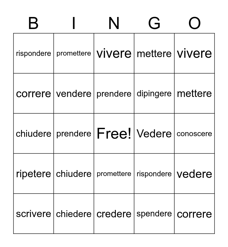 ⚠ This card has duplicate items: scrivere (2), prendere (2), rispondere (2), vivere (2), chiudere (2), correre (2), credere (2), mettere (2), promettere (2)