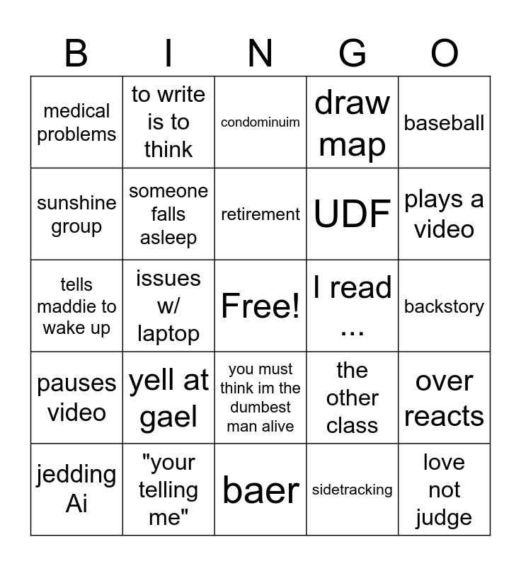 This bingo card has a free space and 24 words: yell at gael, "your telling me", retirement, jedding Ai, baseball, medical problems, sunshine group, to write is to think, I read ..., you must think im the dumbest man alive, UDF, tells maddie to wake up, the other class, over reacts, someone falls asleep, sidetracking, backstory, condominuim, plays a video, issues w/ laptop, love not judge, pauses video, draw map and baer.