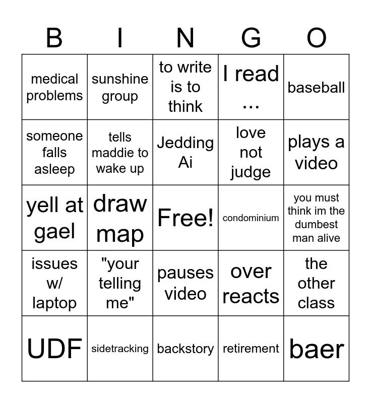 This bingo card has a free space and 24 words: UDF, "your telling me", Jedding Ai, retirement, baseball, medical problems, sunshine group, to write is to think, condominium, you must think im the dumbest man alive, yell at gael, tells maddie to wake up, over reacts, the other class, someone falls asleep, sidetracking, backstory, I read ..., plays a video, issues w/ laptop, draw map, pauses video, love not judge and baer.