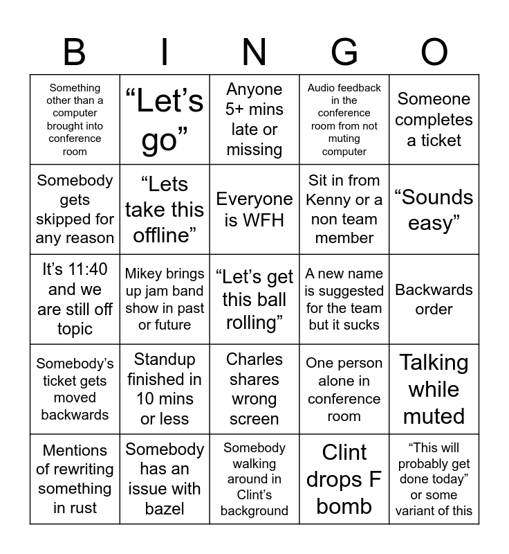 This bingo card has a free space and 24 words: Standup finished in 10 mins or less, Somebody has an issue with bazel, Everyone is WFH, Mentions of rewriting something in rust, Someone completes a ticket, Something other than a computer brought into conference room, Somebody gets skipped for any reason, “Let’s go”, A new name is suggested for the team but it sucks, Charles shares wrong screen, Sit in from Kenny or a non team member, It’s 11:40 and we are still off topic, One person alone in conference room, Talking while muted, “Lets take this offline”, Clint drops F bomb, Backwards order, Anyone 5+ mins late or missing, “Sounds easy”, Mikey brings up jam band show in past or future, “This will probably get done today” or some variant of this, Somebody’s ticket gets moved backwards, Audio feedback in the conference room from not muting computer and Somebody walking around in Clint’s background.