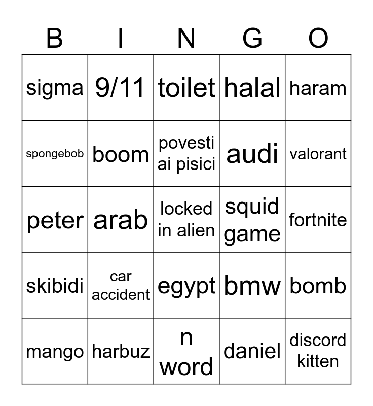 This bingo card has 25 words: skibidi, harbuz, locked in alien, daniel, haram, sigma, 9/11, toilet, squid game, bomb, spongebob, boom, n word, bmw, valorant, mango, arab, povesti ai pisici, audi, fortnite, peter, car accident, egypt, halal and discord kitten.