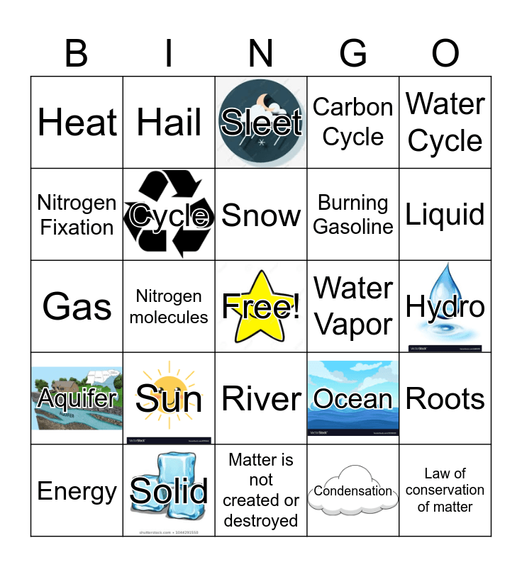 This bingo card has 12 images, a free space and 34 words: Evaporation, Condensation, Transpiration, Precipitation, Aquifer, Cycle, Water Cycle, Energy, Hail, Rain, Snow, Sleet, Runoff, Groundwater, Water Vapor, Liquid, Solid, Gas, Sun, Ocean, River, Cold, Heat, Hydro, Matter is not created or destroyed, Law of conservation of matter, Carbon Cycle, Oxygen Cycle, Burning Gasoline, Nitrogen Fixation, Free Nitrogen, Nitrogen molecules, Roots and Bacteria.