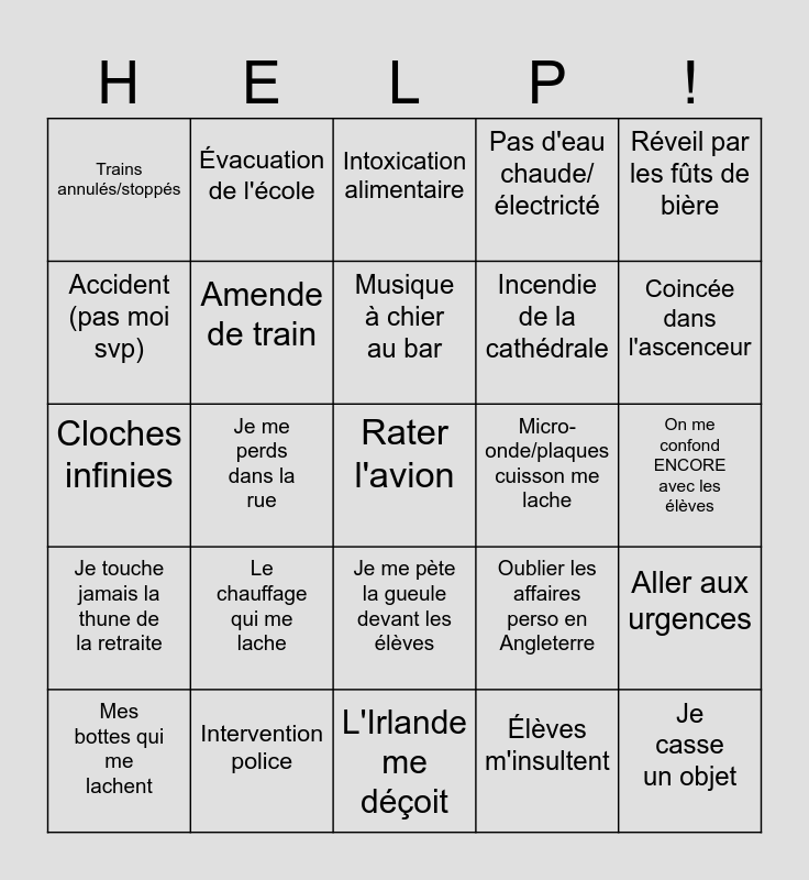 This bingo card has a free space and 24 words: Le chauffage qui me lache, Intervention police, Musique à chier au bar, Mes bottes qui me lachent, Réveil par les fûts de bière, Trains annulés/stoppés, Accident (pas moi svp), Évacuation de l'école, Micro-onde/plaques cuisson me lache, Je me pète la gueule devant les élèves, Incendie de la cathédrale, Cloches infinies, Oublier les affaires perso en Angleterre, Aller aux urgences, Amende de train, Élèves m'insultent, On me confond ENCORE avec les élèves, Intoxication alimentaire, Coincée dans l'ascenceur, Je me perds dans la rue, Je casse un objet, Je touche jamais la thune de la retraite, Pas d'eau chaude/électricté and L'Irlande me déçoit.