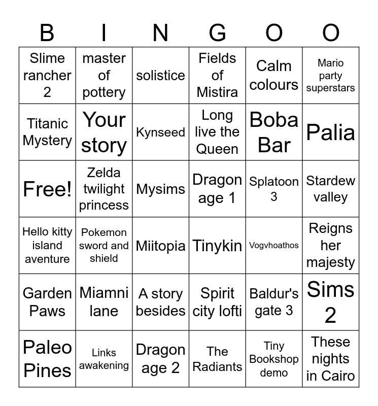 This bingo card has 36 words: Spirit city lofti, A story besides, The Radiants, Titanic Mystery, Hello kitty island aventure, Dragon age 1, Your story, Dragon age 2, Calm colours, Baldur's gate 3, Palia, Fields of Mistira, Sims 2, Zelda twilight princess, Long live the Queen, Slime rancher 2, Garden Paws, Splatoon 3, Free!, solistice, Mysims, Pokemon sword and shield, Tinykin, Miitopia, Vogvhoathos, master of pottery, Boba Bar, Links awakening, Kynseed, Mario party superstars, These nights in Cairo, Paleo Pines, Reigns her majesty, Stardew valley, Miamni lane and Tiny Bookshop demo.