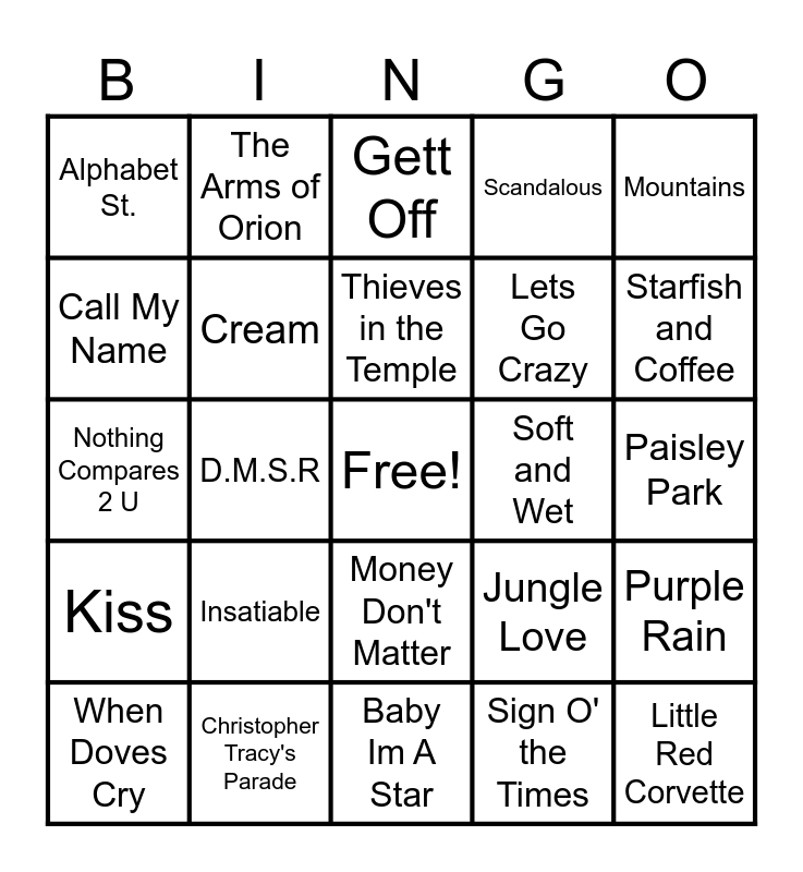 This bingo card has a free space and 29 words: When Doves Cry, Erotic City, D.M.S.R, 7, Alphabet St., Gett Off, Cream, Insatiable, Soft and Wet, Christopher Tracy's Parade, Paisley Park, Little Red Corvette, Baby Im A Star, Sign O' the Times, Starfish and Coffee, U Got the Look, Money Don't Matter, Kiss, Mountains, Nothing Compares 2 U, Jungle Love, Uptown, Lets Go Crazy, Call My Name, Scandalous, The Arms of Orion, Purple Rain, Thieves in the Temple and International Lover.