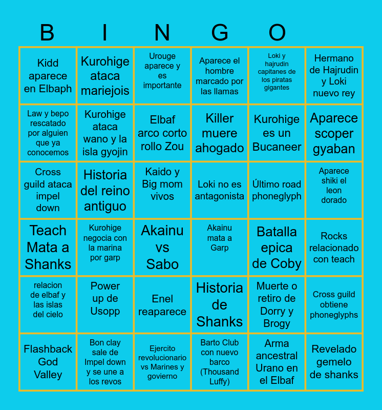 This bingo card has 36 words: Historia de Shanks, Enel reaparece, Barto Club con nuevo barco (Thousand Luffy), Law y bepo rescatado por alguien que ya conocemos, Teach Mata a Shanks, Loki no es antagonista, Kurohige ataca wano y la isla gyojin, Ejercito revolucionario vs Marines y govierno, Loki y hajrudin capitanes de los piratas gigantes, Muerte o retiro de Dorry y Brogy, Aparece scoper gyaban, Aparece el hombre marcado por las llamas, Cross guild obtiene phoneglyphs, Historia del reino antiguo, Killer muere ahogado, Kidd aparece en Elbaph, relacion de elbaf y las islas del cielo, Último road phoneglyph, Cross guild ataca impel down, Urouge aparece y es importante, Kaido y Big mom vivos, Kurohige negocia con la marina por garp, Akainu mata a Garp, Akainu vs Sabo, Batalla epica de Coby, Kurohige ataca mariejois, Kurohige es un Bucaneer, Bon clay sale de Impel down y se une a los revos, Elbaf arco corto rollo Zou, Hermano de Hajrudin y Loki nuevo rey, Revelado gemelo de shanks, Flashback God Valley, Rocks relacionado con teach, Aparece shiki el leon dorado, Power up de Usopp and Arma ancestral Urano en el Elbaf.