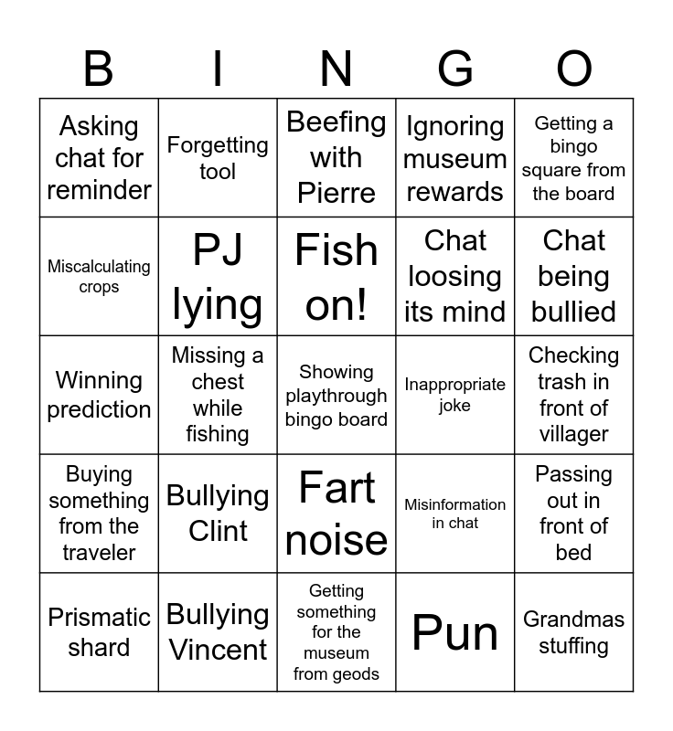 This bingo card has a free space and 24 words: Bullying Clint, Bullying Vincent, Fish on!, Prismatic shard, Getting a bingo square from the board, Asking chat for reminder, Miscalculating crops, Forgetting tool, Inappropriate joke, Fart noise, Chat loosing its mind, Winning prediction, Misinformation in chat, Passing out in front of bed, PJ lying, Pun, Checking trash in front of villager, Beefing with Pierre, Chat being bullied, Missing a chest while fishing, Grandmas stuffing, Buying something from the traveler, Ignoring museum rewards and Getting something for the museum from geods.