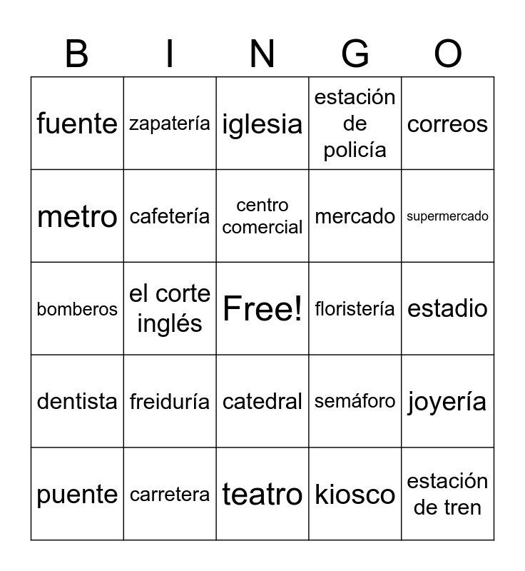This bingo card has a free space and 40 words: ayuntamiento, bomberos, bares, cafetería, carretera, catedral, centro comercial, cine, correos, dentista, el corte inglés, estación de policía, estación de tren, estadio, floristería, freiduría, frutería, fuente, hospital, iglesia, joyería, kiosco, mercado, metro, museo, palacio, parada de autobuses, parada del metro, pastelería, playa, plaza, puente, restaurante, semáforo, supermercado, teatro, tienda orgánica, torre, zapatería and zoológico.