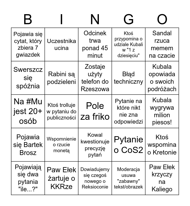 This bingo card has a free space and 24 words: Wspomnienie o rzucie monetą, Paw Ełek żartuje o KKRze, Zostaje użyty telefon do Rzeszowa, Pojawiają się dwa pytania "ile...?", Sandal rzuca memem na czacie, Pojawia się cytat, który zbiera 7 gwiazdek, Swerszcz się spóźnia, Uczestnika ucina, Pytanie na które nikt nie zna odpowiedzi, Kowal kwestionuje precyzję pytań, Błąd techniczny, Na #Mu jest 20+ osób, Pytanie o CoS2, Ktoś wspomina o Kretonie, Rabini są podzieleni, Moderacja usuwa "zabawny" tekst/obrazek, Kubala wygrywa milion piesos!, Odcinek trwa ponad 45 minut, Kubala opowiada o swoich podróżach, Ktoś trolluje w pytaniu do publiczności, Paw Ełek krzyczy na Kaliego, Pojawia się Bartek Brosz, Ktoś przypomina o udziale Kubali w "1 z dziesięciu" and Dowiadujemy się czegoś nowego o Reksioconie.