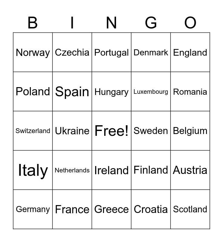 This bingo card has a free space and 24 words: Netherlands, France, Hungary, Germany, England, Norway, Poland, Czechia, Sweden, Ireland, Luxembourg, Switzerland, Finland, Austria, Spain, Croatia, Belgium, Portugal, Romania, Ukraine, Scotland, Italy, Denmark and Greece.