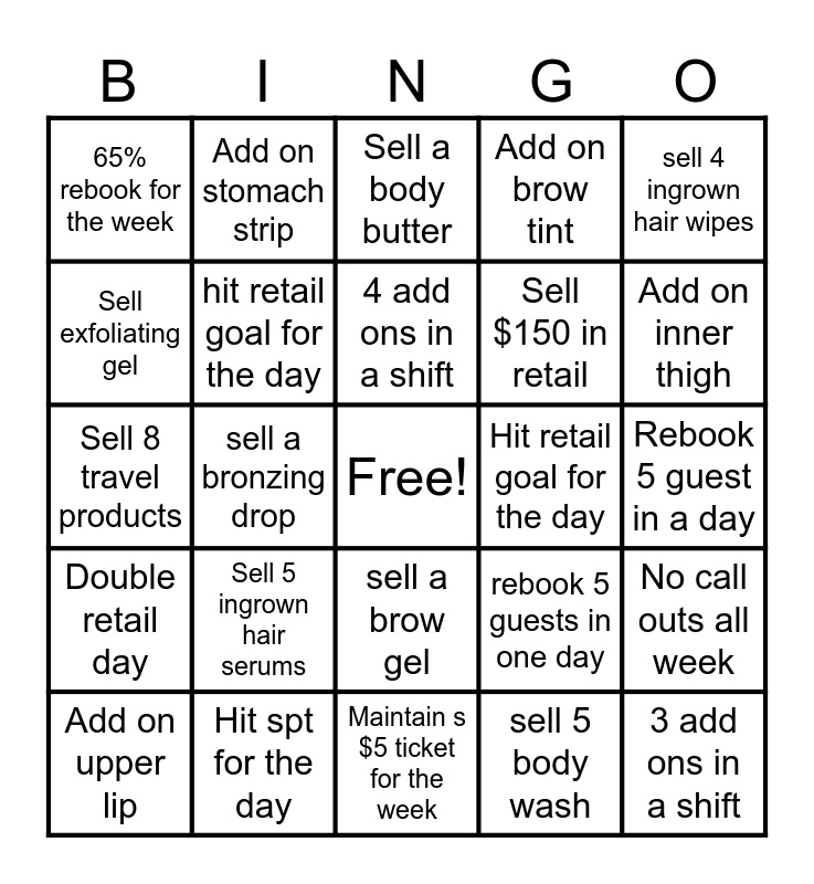This bingo card has a free space and 24 words: Sell 5 ingrown hair serums, Hit spt for the day, 4 add ons in a shift, Add on upper lip, sell 4 ingrown hair wipes, 65% rebook for the week, Sell exfoliating gel, Add on stomach strip, Hit retail goal for the day, sell a brow gel, Sell $150 in retail, Sell 8 travel products, rebook 5 guests in one day, No call outs all week, hit retail goal for the day, sell 5 body wash, Rebook 5 guest in a day, Sell a body butter, Add on inner thigh, sell a bronzing drop, 3 add ons in a shift, Double retail day, Add on brow tint and Maintain s $5 ticket for the week.