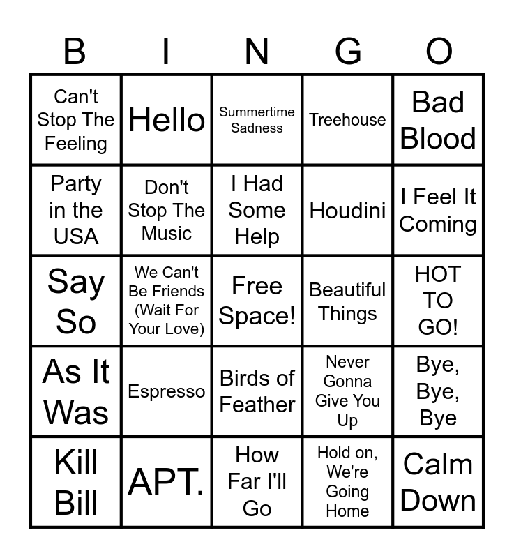 This bingo card has a free space and 24 words: Espresso, APT., I Had Some Help, Kill Bill, Bad Blood, Can't Stop The Feeling, Party in the USA, Hello, Beautiful Things, Birds of Feather, Houdini, Say So, Never Gonna Give You Up, Bye, Bye, Bye, Don't Stop The Music, Hold on, We're Going Home, HOT TO GO!, Summertime Sadness, I Feel It Coming, We Can't Be Friends (Wait For Your Love), Calm Down, As It Was, Treehouse and How Far I'll Go.
