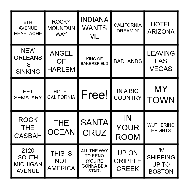This bingo card has a free space and 57 words: 16TH AVENUE, 2120 SOUTH MICHIGAN AVENUE, 29 PALMS, 6TH AVENUE HEARTACHE, ALL THE WAY TO RENO (YOU'RE GONNA BE A STAR), ALLISON ROAD, ANGEL OF HARLEM, BACK IN THE U.S.A., BADLANDS, CADILLAC RANCH, CALIFORNIA DREAMIN', DOWN BY THE RIVER, FIRE LAKE, GALVESTON, HARLEM SHUFFLE, HAWAII FIVE-O, HOTEL ARIZONA, HOTEL CALIFORNIA, HOUSE OF THE RISING SUN, I'M SHIPPING UP TO BOSTON, IN A BIG COUNTRY, IN MY ROOM, IN YOUR ROOM, INDIANA WANTS ME, IS ANYBODY GOIN' TO SAN ANTONE, KING OF BAKERSFIELD, KINGS HIGHWAY, LAKE OF FIRE, LEAVING LAS VEGAS, LIFE IN A NORTHERN TOWN, MALIBU, MAN ON THE MOON, MARRAKESH EXPRESS, MULL OF KINTYRE, MY TOWN, NEW ORLEANS IS SINKING, NIGHTS ON BROADWAY, PET SEMATARY, PHILADELPHIA FREEDOM, ROCK THE CASBAH, ROCKY MOUNTAIN WAY, SANTA CRUZ, SHAMBALA, TAKE ME TO THE RIVER, TENTH AVENUE FREEZE-OUT, THE NIGHT CHICAGO DIED, THE OCEAN, THIS IS NOT AMERICA, THIS TOWN, TOBACCO ROAD, TUPELO HONEY, UP ON CRIPPLE CREEK, WEST END GIRLS, WHEN I GET TO HEAVEN, WILD WILD WEST, WUTHERING HEIGHTS and YOUNGSTOWN.