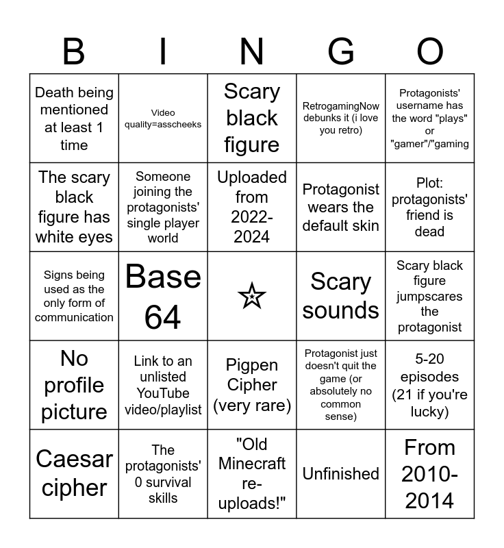 This bingo card has a free space and 29 words: Caesar cipher, Morse code, Base 64, Binary code, Death being mentioned at least 1 time, Scary black figure, Someone joining the protagonists' single player world, Link to an unlisted YouTube video/playlist, Scary sounds, The protagonists' 0 survival skills, Scary black figure jumpscares the protagonist, From 2010-2014, "Old Minecraft re-uploads!", Unfinished, Plot: protagonists' friend is dead, Protagonists' world is haunted ooo scary, Pigpen Cipher (very rare), No profile picture, Protagonists' username has the word "plays" or "gamer"/"gaming, Signs being used as the only form of communication, Protagonist just doesn't quit the game (or absolutely no common sense), The word "help" being mentioned at least 2 times, Protagonist wears the default skin, The scary black figure has white eyes, RetrogamingNow debunks it (i love you retro), Video quality=asscheeks, 5-20 episodes (21 if you're lucky), Uploaded from 2022-2024 and The word "why" being overused.