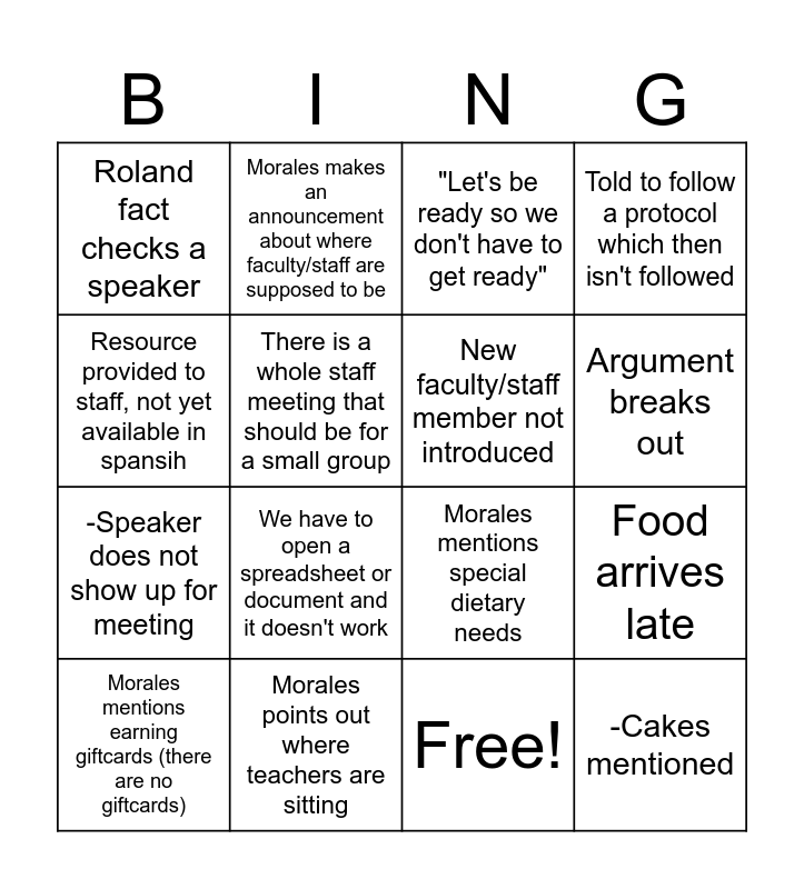 This bingo card has 17 words: Free!, Morales mentions earning giftcards (there are no giftcards), "Let's be ready so we don't have to get ready", Roland fact checks a speaker, We have to open a spreadsheet or document and it doesn't work, Told to follow a protocol which then isn't followed, Food arrives late, New faculty/staff member not introduced, Argument breaks out, There is a whole staff meeting that should be for a small group, Morales points out where teachers are sitting, Morales mentions special dietary needs, Resource provided to staff, not yet available in spansih, Morales makes an announcement about where faculty/staff are supposed to be, -Speaker does not show up for meeting, -Morales does his wildcat rawr and -Cakes mentioned.