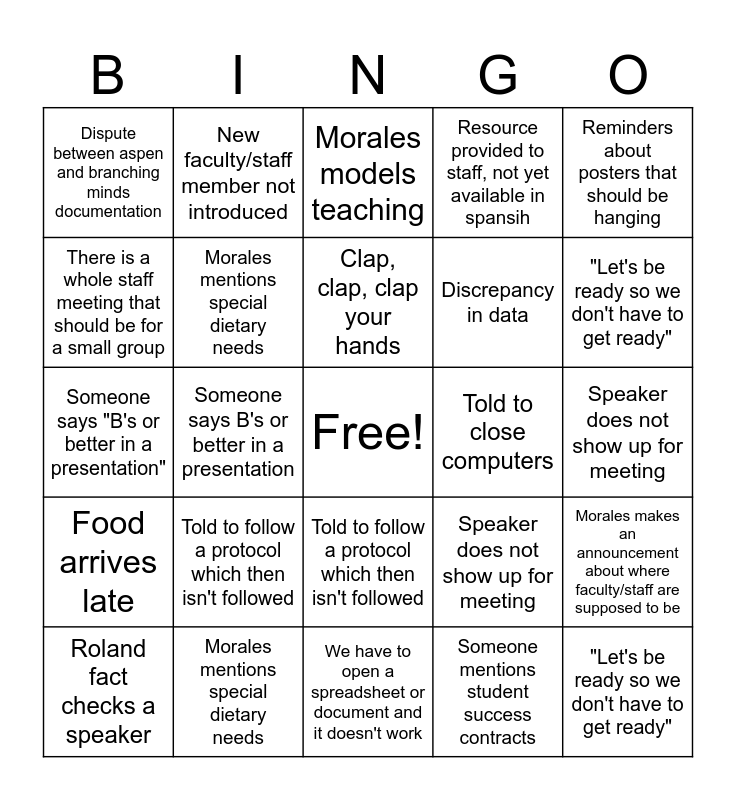 ⚠ This card has duplicate items: Morales mentions earning giftcards (there are no giftcards) (2), "Let's be ready so we don't have to get ready" (2), Roland fact checks a speaker (2), We have to open a spreadsheet or document and it doesn't work (2), Told to follow a protocol which then isn't followed (2), Food arrives late (2), New faculty/staff member not introduced (2), Argument breaks out (2), There is a whole staff meeting that should be for a small group (2), Morales points out where teachers are sitting (2), Morales mentions special dietary needs (2), Resource provided to staff, not yet available in spansih (2), Morales makes an announcement about where faculty/staff are supposed to be (2), Speaker does not show up for meeting (2), Morales does his wildcat rawr (2), Cakes mentioned (2), Reminders about posters that should be hanging (2), Someone mentions student success contracts (2), Discrepancy in data (2)