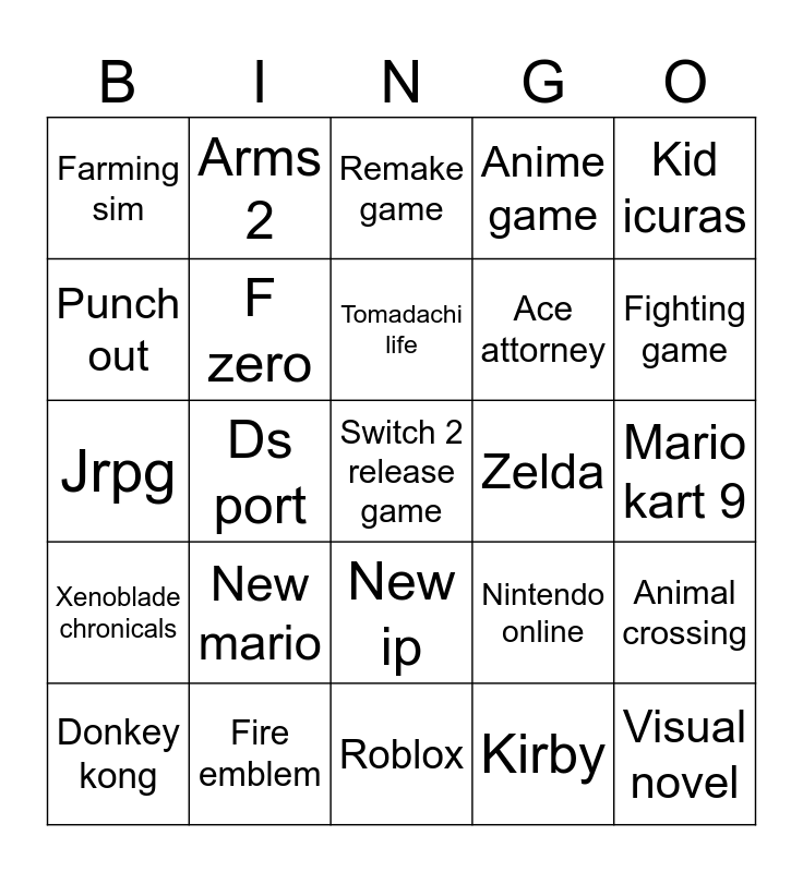 This bingo card has a free space and 24 words: New mario, Fire emblem, Tomadachi life, Donkey kong, Kid icuras, Farming sim, Punch out, Arms 2, Zelda, New ip, Ace attorney, Jrpg, Nintendo online, Animal crossing, F zero, Kirby, Mario kart 9, Remake game, Fighting game, Ds port, Visual novel, Xenoblade chronicals, Anime game and Roblox.