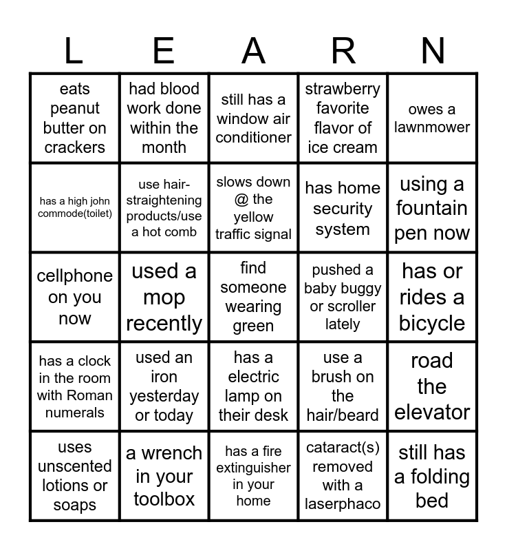 This bingo card has a free space and 24 words: used an iron yesterday or today, a wrench in your toolbox, slows down @ the yellow traffic signal, uses unscented lotions or soaps, owes a lawnmower, eats peanut butter on crackers, has a high john commode(toilet), had blood work done within the month, pushed a baby buggy or scroller lately, has a electric lamp on their desk, has home security system, cellphone on you now, use a brush on the hair/beard, road the elevator, use hair-straightening products/use a hot comb, cataract(s) removed with a laserphaco, has or rides a bicycle, still has a window air conditioner, using a fountain pen now, used a mop recently, still has a folding bed, has a clock in the room with Roman numerals, strawberry favorite flavor of ice cream and has a fire extinguisher in your home.