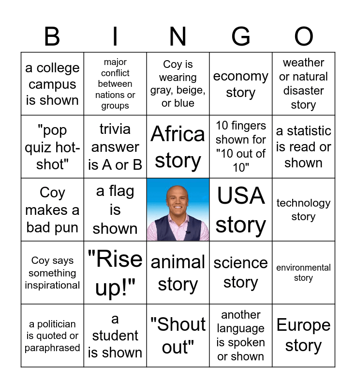 This bingo card has a free space and 29 words: a politician is quoted or paraphrased, a body of water shown, a flag is shown, Asia story, a college campus is shown, Coy is wearing gray, beige, or blue, trivia answer is A or B, "Rise up!", USA story, a student is shown, technology story, Europe story, "Shout out", another language is spoken or shown, a statistic is read or shown, aerial view of a city, animal story, Coy says something inspirational, weather or natural disaster story, Coy makes a bad pun, science story, trivia answer is C or D, 10 fingers shown for "10 out of 10", "pop quiz hot-shot", economy story, major conflict between nations or groups, environmental story, Africa story and Oceania story.