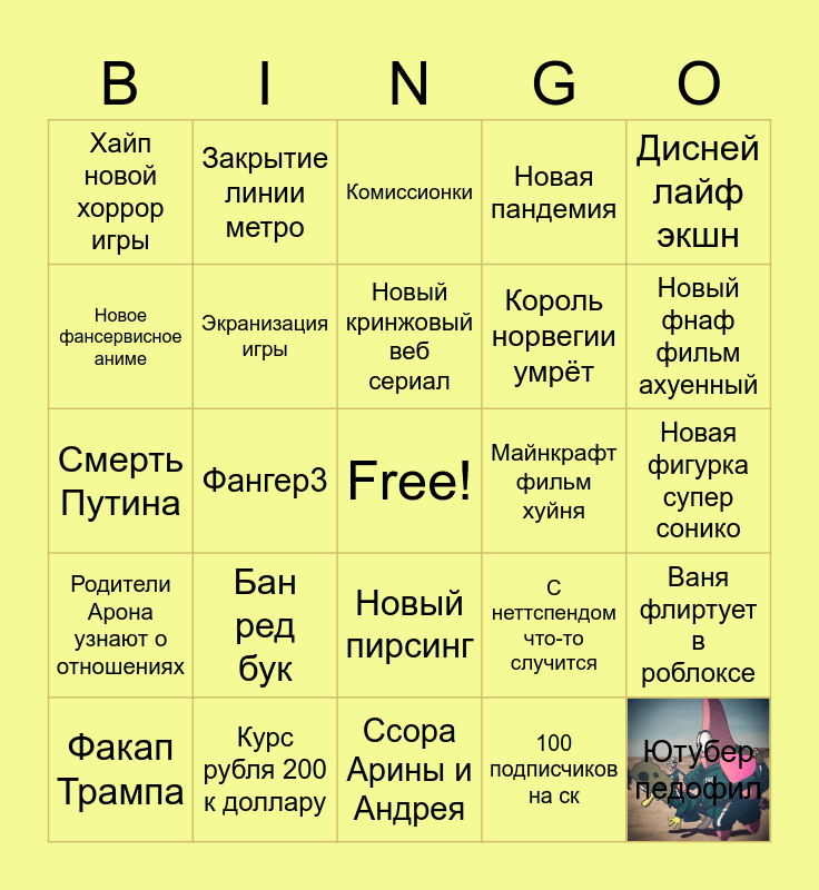 This bingo card has 1 images, a free space and 24 words: Факап Трампа, Бан ред бук, Новый кринжовый веб сериал, 100 подписчиков на ск, Дисней лайф экшн, Хайп новой хоррор игры, Закрытие линии метро, Комиссионки, Майнкрафт фильм хуйня, Новая фигурка супер сонико, Смерть Путина, Экранизация игры, С неттспендом что-то случится, Ваня флиртует в роблоксе, Новое фансервисное аниме, Курс рубля 200 к доллару, Ссора Арины и Андрея, Новая пандемия, Новый фнаф фильм ахуенный, Родители Арона узнают о отношениях, Фангер3, Новый пирсинг, Король норвегии умрёт and Ютубер педофил.