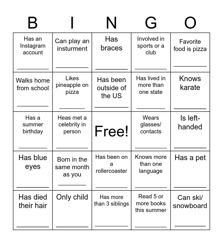 This bingo card has a free space and 24 words: Born in the same month as you ________, Only child ________, Has been outside of the US _________, Has died their hair ________, Favorite food is pizza __________, Has an Instagram account __________, Walks home from school _________, Can play an insturment _________, Wears glasses/ contacts __________, Has been on a rollercoaster __________, Has lived in more than one state _________, Has a summer birthday _________, Knows more than one language __________, Has a pet ________, Likes pineapple on pizza ________, Read 5 or more books this summer __________, Is left-handed ________, Has braces ________, Knows karate ________, Heas met a celebrity in person __________, Can ski/ snowboard ________, Has blue eyes ________, Involved in sports or a club __________ and Has more than 3 siblings ___________.
