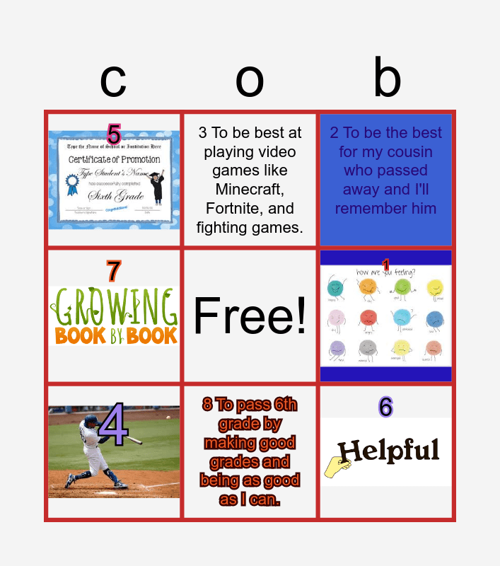 This bingo card has 5 images, a free space and 8 words: 1, 2 To be the best for my cousin who passed away and I'll remember him, 3 To be best at playing video games like Minecraft, Fortnite, and fighting games., 4, 5, 6, 7 and 8 To pass 6th grade by making good grades and being as good as I can..