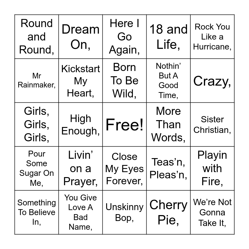 This bingo card has a free space and 60 words: Photograph,, You Give Love A Bad Name,, Sweet Child O’ Mine,, Pour Some Sugar On Me,, Cherry Pie,, Kiss Me Deadly,, Kickstart My Heart,, Metal Health (Bang Your Head),, Nothin’ But A Good Time,, Dude (Looks Like A Lady),, 18 and Life,, I Wanna Rock,, Mr Rainmaker,, Sometimes She Cries,, Gypsy Road,, Round and Round,, We’re Not Gonna Take It,, Rock You Like a Hurricane,, Once Bitten Twice Shy,, Born To Be Wild,, More Than Words,, Here I Go Again,, Something To Believe In,, Playin with Fire,, Dr Feelgood,, Lack of Communication,, Can’t Get Enough,, I Don’t Want to Miss a Thing,, Crazy,, School’s Out,, Poison,, Paranoid,, To Be With You,, Wanted Dead or Alive,, Dream On,, Walk This Way,, Rock and Roll All Nite,, High Enough,, Jump,, Girls, Girls, Girls,, Don’t Know What You Got (Till It’s Gone),, Livin’ on a Prayer,, Sister Christian,, Get the Funk Out,, Teas’n, Pleas’n,, Youth Gone Wild,, Wait,, Just Like Paradise,, I Remember, Close My Eyes Forever,, Unskinny Bop,, When I look Into Your Eyes, Love Bites,, Headed for a Heartbreak,, Final Countdown,, Seventeen,, Patience,, Love of a Lifetime,, Bad Medicine, and Cryin.