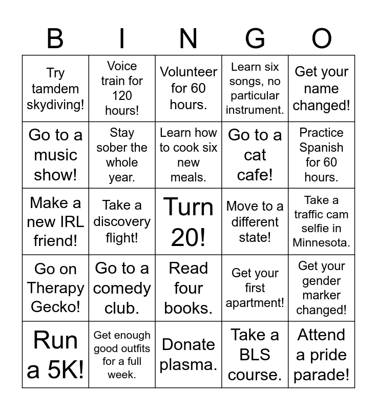 This bingo card has a free space and 24 words: Go to a comedy club., Get enough good outfits for a full week., Learn how to cook six new meals., Run a 5K!, Get your name changed!, Try tamdem skydiving!, Go to a music show!, Voice train for 120 hours!, Move to a different state!, Read four books., Go to a cat cafe!, Make a new IRL friend!, Get your first apartment!, Get your gender marker changed!, Stay sober the whole year., Take a BLS course., Take a traffic cam selfie in Minnesota., Volunteer for 60 hours., Practice Spanish for 60 hours., Take a discovery flight!, Attend a pride parade!, Go on Therapy Gecko!, Learn six songs, no particular instrument. and Donate plasma..