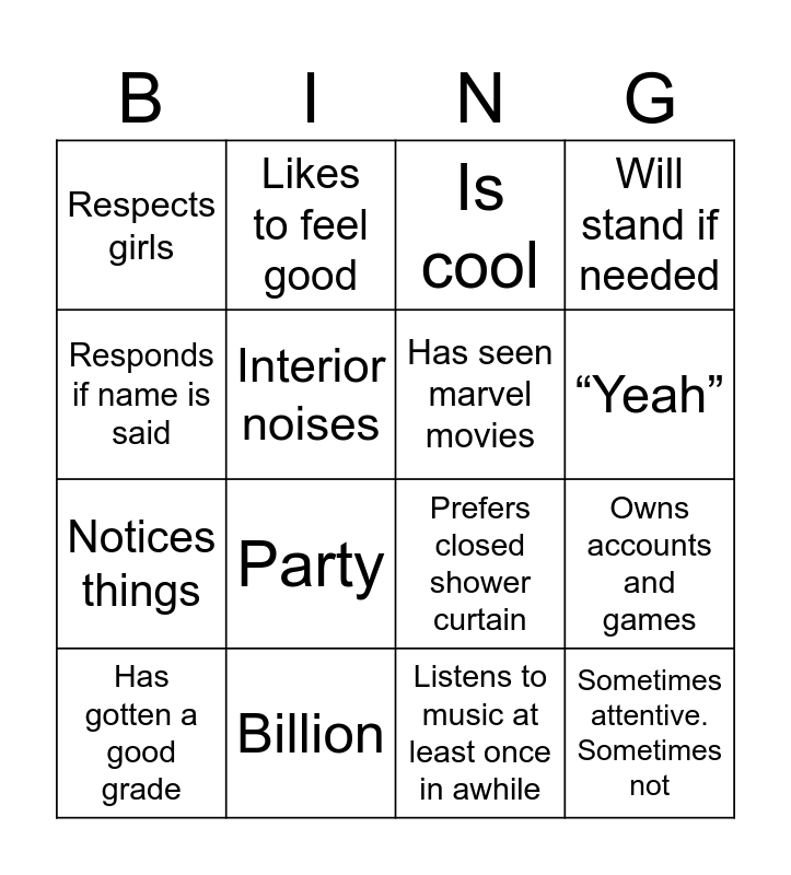 This bingo card has 16 words: Has gotten a good grade, Billion, Is cool, Will stand if needed, Responds if name is said, Likes to feel good, Prefers closed shower curtain, Owns accounts and games, Respects girls, Interior noises, Listens to music at least once in awhile, “Yeah”, Notices things, Party, Has seen marvel movies and Sometimes attentive. Sometimes not.