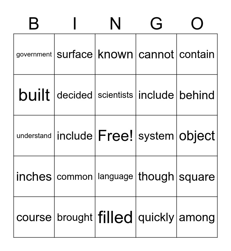 This bingo card has a free space and 34 words: finally, quickly, became, minutes, inches, decided, contain, course, surface, produce, scientists, known, island, machine, system, behind, brought, understand, common, though, language, equation, government, object, filled, among, cannot, material, include, built, heavy, include, square and syllable.