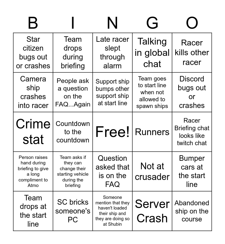 This bingo card has a free space and 24 words: Team asks if they can change their starting vehicle during the briefing, SC bricks someone's PC, Support ship bumps other support ship at start line, Team drops at the start line, Racer kills other racer, Star citizen bugs out or crashes, Camera ship crashes into racer, Team drops during briefing, Runners, Question asked that is on the FAQ, Team goes to start line when not allowed to spawn ships, Crime stat, Not at crusader, Bumper cars at the start line, People ask a question on the FAQ...Again, Server Crash, Racer Briefing chat looks like twitch chat, Late racer slept through alarm, Discord bugs out or crashes, Countdown to the countdown, Abandoned ship on the course, Person raises hand during briefing to give a long compliment to Atmo, Talking in global chat and Someone mention that they haven't loaded their ship and they are doing so at Shubin.