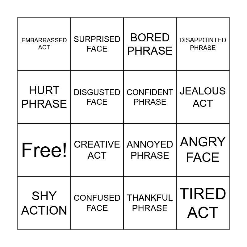 This bingo card has 20 words: ANGRY FACE, SCARED ACT, BORED PHRASE, SAD FACE, SHY ACTION, HURT PHRASE, CONFUSED FACE, EMBARRASSED ACT, Free!, SURPRISED FACE, CREATIVE ACT, ANNOYED PHRASE, DISGUSTED FACE, TIRED ACT, CONFIDENT PHRASE, HAPPY FACE, JEALOUS ACT, DISAPPOINTED PHRASE, THANKFUL PHRASE and CALM ACT.