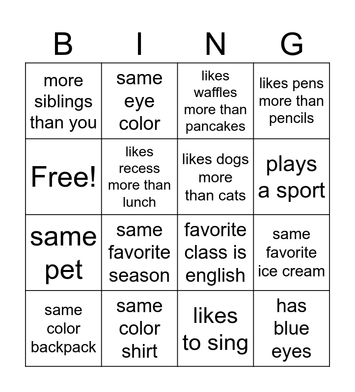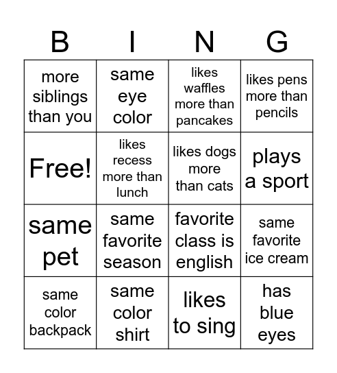This bingo card has 16 words: same color shirt, same favorite ice cream, likes waffles more than pancakes, more siblings than you, same pet, same eye color, favorite class is english, likes to sing, Free!, likes recess more than lunch, same color backpack, likes pens more than pencils, same favorite season, plays a sport, likes dogs more than cats and has blue eyes.