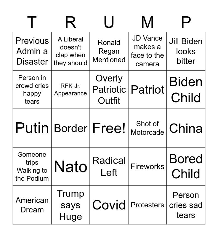 This bingo card has a free space and 59 words: Biden Look Confused, Trump says Huge, Celebrity Apperance, Someone trips Walking to the Podium, Protesters, Someone says Record # of Votes, RFK Jr. Appearance, Elon Shows up in a Cyber Truck, Patriot, Melania looks Fabulous, JD Vance makes a face to the camera, Maga hat, Person in crowd cries happy tears, Salute, Secret Service woman, Previous Admin a Disaster, Person cries sad tears, Jill Biden looks bitter, Flag waving, Overly Patriotic Outfit, Shot of Motorcade, Ronald Regan Mentioned, American Dream, Bored Child, Excited Child, Elon arrives in Tesla, LA Fires, Trump Child, Biden Child, Secret Service Man, Assassination Attempt Mentioned, Actual Assassination Attempt, Biden Doesn't Looks Confused, Kamala looks bitter, A Liberal doesn't clap when they should, Someone on their phone, Trump does hand gesture, Border, Russia, Putin, Ukraine, Nato, China, Tariffs, Fake News, Woke, Inflation, Economy, Radical Left, Covid, Immigrant, Very Big, Shot of Trash Truck, Hope, Change, Fireworks, Arial Shot of Crowd, Trump Supporter Interview and Unity.