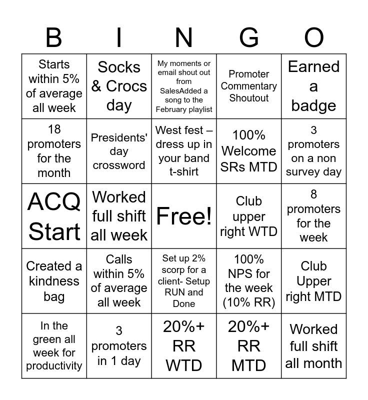 This bingo card has a free space and 27 words: 100% NPS for the week (10% RR), 95+% first check ins for the month, 100% Welcome SRs MTD, 20%+ RR WTD, 18 promoters for the month, My moments or email shout out from SalesAdded a song to the February playlist, Socks & Crocs day, Created a kindness bag, Club upper right WTD, Club Upper right MTD, ACQ Start, Promoter Commentary Shoutout, In the green all week for productivity, 3 promoters in 1 day, 3 promoters on a non survey day, Brought cards to pass out for kindness week, Presidents' day crossword, West fest – dress up in your band t-shirt, Calls within 5% of average all week, Starts within 5% of average all week, 8 promoters for the week, 20%+ RR MTD, Worked full shift all week, Worked full shift all month, Set up 2% scorp for a client- Setup RUN and Done, Earned a badge and No detractors for the month.