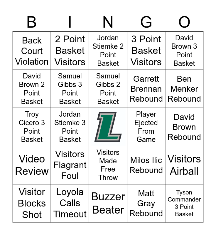 This bingo card has a free space and 77 words: Velko Ilic 2 Point Basket, Troy Cicero 2 Point Basket, Jordan Stiemke 2 Point Basket, Greg Guidinger 2 Point Basket, Peter Sposito 2 Point Basket, Jacob Theodosiou 2 Point Basket, Braeden Speed 2 Point Basket, Goap Kodi 2 Point Basket, Milos Ilic 2 Point Basket, Ben Menker 2 Point Basket, Garrett Brennan 2 Point Basket, Tyson Commander 2 Point Basket, Samuel Gibbs 2 Point Basket, David Brown 2 Point Basket, Matt Gray 2 Point Basket, Jordan Stiemke 3 Point Basket, Jacob Theodosiou 3 Point Basket, Tyson Commander 3 Point Basket, Braeden Speed 3 Point Basket, David Brown 3 Point Basket, Milos Ilic 3 Point Basket, Troy Cicero 3 Point Basket, Samuel Gibbs 3 Point Basket, 2 Point Basket Visitors, 3 Point Basket Visitors, Veljko Ilic Rebound, Troy Cicero Rebound, Jordan Stiemke Rebound, Greg Guidinger Rebound, Peter Sposito Rebound, Jacob Theodosiou Rebound, Braeden Speed Rebound, Goap Kodi Rebound, Milos Ilic Rebound, Ben Menker Rebound, Garrett Brennan Rebound, Tyson Commander Rebound, Samuel Gibbs Rebound, David Brown Rebound, Matt Gray Rebound, Double Dribble Violation, Loyola Shot Clock Violation, Visitors Shot Clock Violation, Loyola Slam Dunk, Visitors Slam Dunk, Loyola Blocks Shot, Visitor Blocks Shot, Back Court Violation, 3 Second Violation, 5 Second Violation, Loyola Made Free Throw, Visitors Made Free Throw, Loyola Goaltending Violation, Visitors Goaltending Violation, Loyola Traveling Violation, Visitors Traveling Violation, Loyola Turnover, Visitors Turnover, Kicked Ball Violation, Loyola Flagrant Foul, Visitors Flagrant Foul, Loyola Player Fouls Out, Visitors Player Fouls Out, Technical Foul Loyola Player, Technical Foul Visitors Player, Technical Foul Loyola Coach, Technical Foul Visitors Coach, Player Ejected From Game, Coach Ejected From Game, Loyola Leads At Halftime, Loyola Wins Game, Visitors Airball, Video Review, Loyola Calls Timeout, Visitors Call Timeout, Buzzer Beater and Jump Ball.