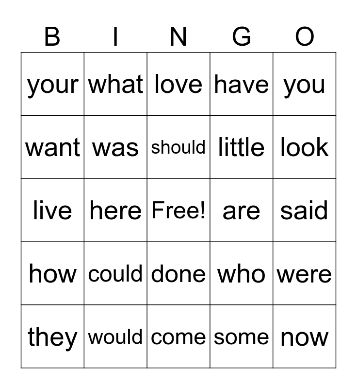 This bingo card has a free space and 24 words: could, would, should, they, you, your, want, what, are, done, little, live, who, were, was, some, said, love, look, here, now, how, have and come.