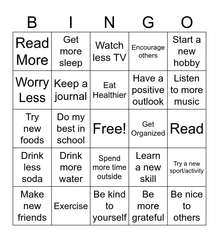 This bingo card has a free space and 24 words: Drink more water, Exercise, Eat Healthier, Make new friends, Start a new hobby, Read More, Worry Less, Get more sleep, Get Organized, Spend more time outside, Have a positive outlook, Try new foods, Learn a new skill, Try a new sport/activity, Keep a journal, Be more grateful, Read, Watch less TV, Listen to more music, Do my best in school, Be nice to others, Drink less soda, Encourage others and Be kind to yourself.
