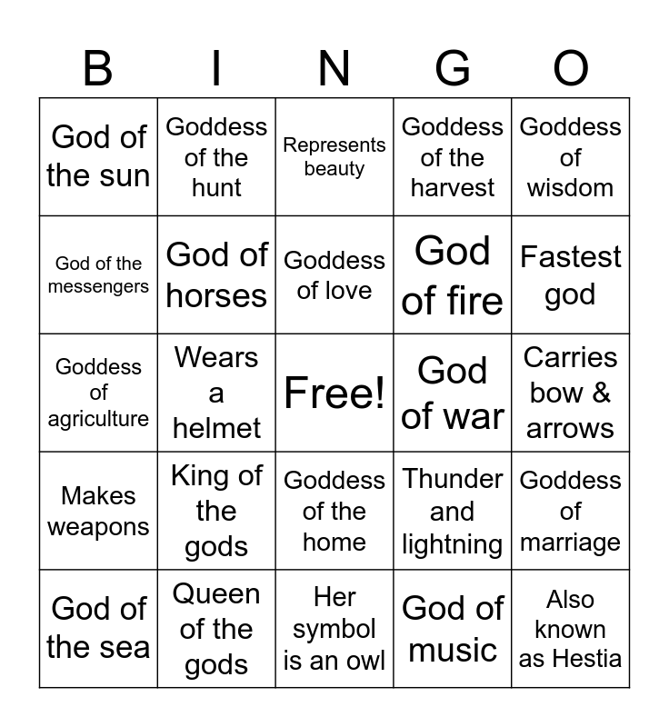 This bingo card has a free space and 24 words: King of the gods, Queen of the gods, Goddess of love, God of the sea, Goddess of wisdom, God of the sun, God of the messengers, Goddess of the hunt, God of war, Goddess of the home, God of fire, Goddess of agriculture, Thunder and lightning, Goddess of marriage, God of horses, God of music, Carries bow & arrows, Represents beauty, Fastest god, Wears a helmet, Also known as Hestia, Makes weapons, Goddess of the harvest and Her symbol is an owl.