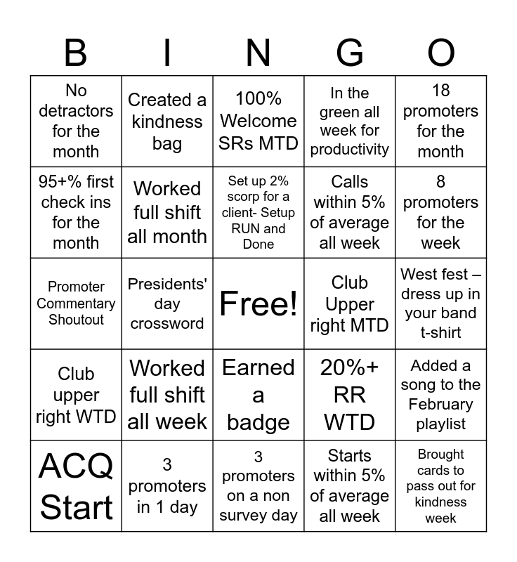 This bingo card has a free space and 28 words: Added a song to the February playlist, Socks & Crocs day, Calls within 5% of average all week, Starts within 5% of average all week, 95+% first check ins for the month, 100% Welcome SRs MTD, Created a kindness bag, Club upper right WTD, Club Upper right MTD, ACQ Start, Promoter Commentary Shoutout, In the green all week for productivity, 3 promoters in 1 day, 3 promoters on a non survey day, 8 promoters for the week, 20%+ RR MTD, Worked full shift all week, Worked full shift all month, Set up 2% scorp for a client- Setup RUN and Done, Earned a badge, No detractors for the month, 100% NPS for the week (10% RR), Brought cards to pass out for kindness week, Presidents' day crossword, West fest – dress up in your band t-shirt, 20%+ RR WTD, 18 promoters for the month and My moments or email shout out from Sales.