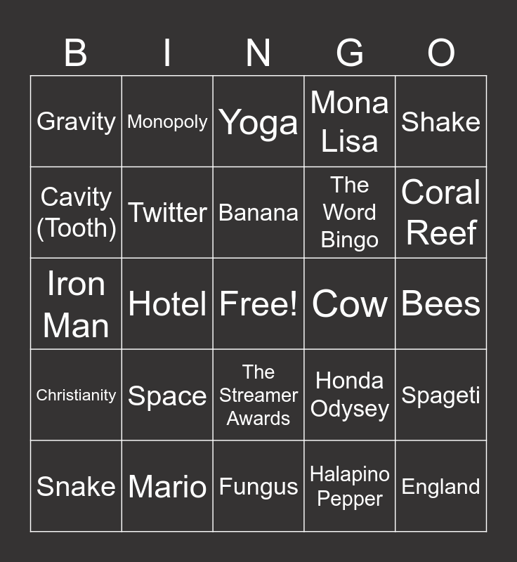 This bingo card has a free space and 24 words: Space, Mario, Banana, Snake, Shake, Gravity, Cavity (Tooth), Monopoly, Cow, The Streamer Awards, The Word Bingo, Iron Man, Honda Odysey, Spageti, Twitter, Halapino Pepper, Bees, Yoga, Coral Reef, Hotel, England, Christianity, Mona Lisa and Fungus.